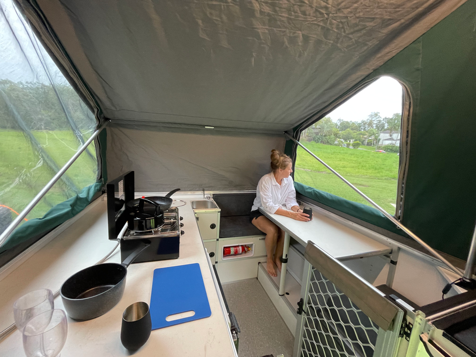Sit or prepare meals outside under the awning or head up into the camper if the weather is bad or insects are out. Inside there is accommodation for up to 5 people, ample storage, full kitchen, sink, 100L upright fridge/freezer, lounge and dining table.