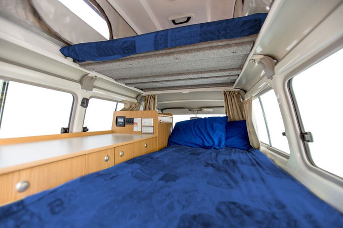 The main bed is in the pop-top section, above the cabin of the vehicle. The bed has additional foam insert for comfort and is approximately the size of a double bed.